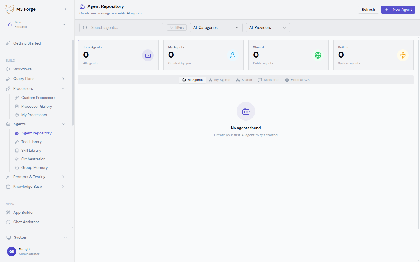 M3 Forge provides a comprehensive agent management system for building, deploying, and orchestrating AI agents. Create autonomous agents with custom tools and skills, coordinate multi-agent workflows, and share context through group memory.