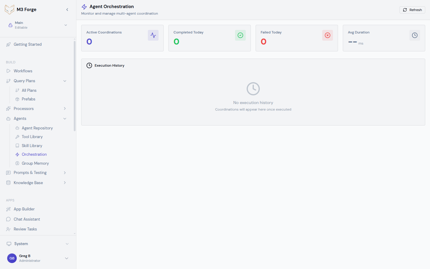 Coordinate multiple agents to solve complex tasks that exceed the capabilities of single agents. M3 Forge provides orchestration patterns for sequential pipelines, parallel execution, hierarchical delegation, and dynamic routing.