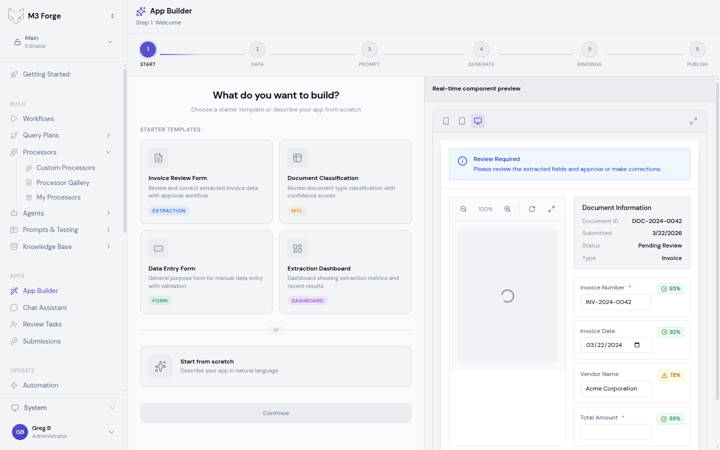 The App Builder is a visual wizard for creating custom applications without writing code. Build document submission portals, approval interfaces, data collection forms, and specialized tools using pre-built templates and drag-and-drop configuration.