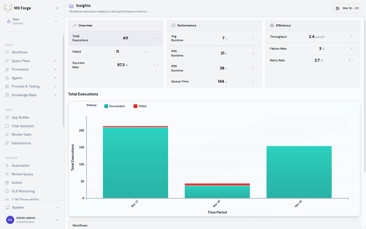 The Insights dashboard provides high-level analytics for workflow execution performance. It aggregates data across all workflow runs to help you: