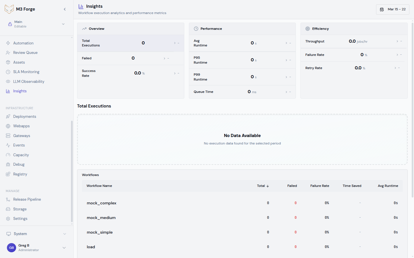 The Insights dashboard provides high-level analytics for workflow execution performance. It aggregates data across all workflow runs to help you: