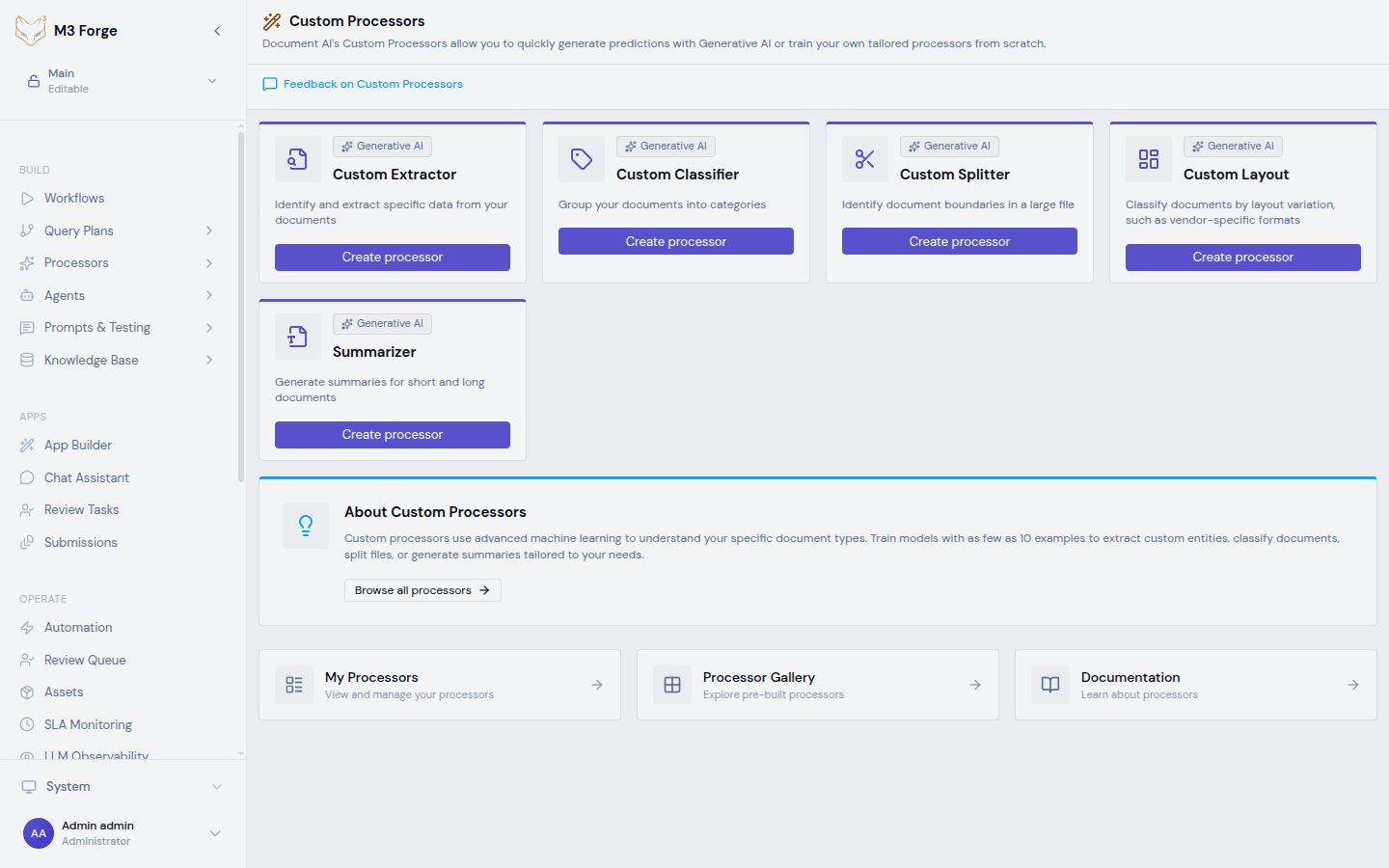 Processors are the intelligence layer of M3 Forge, transforming raw documents into structured, actionable data. They power document understanding through classification, extraction, splitting, layout analysis, and summarization using Generative AI and machine learning models you can train on your own data.
