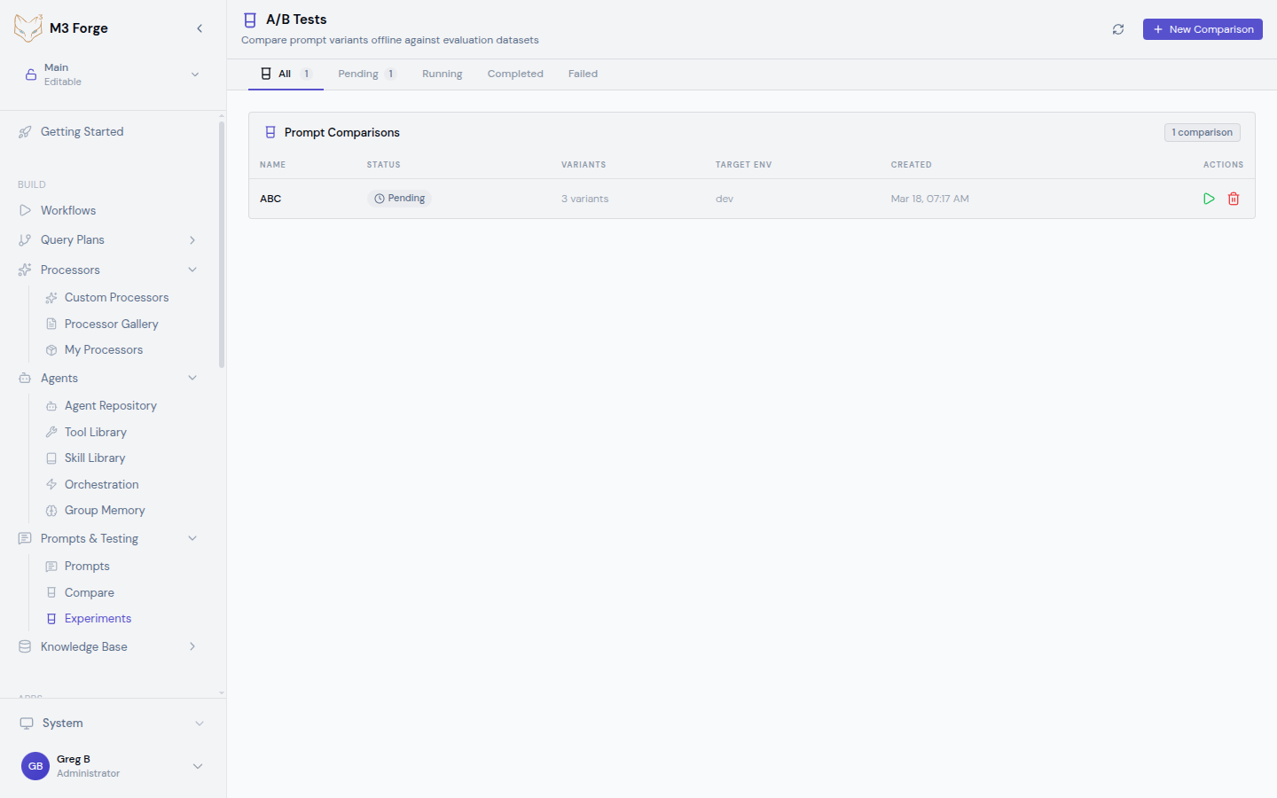 Run controlled A/B tests to systematically optimize prompts with statistical rigor. Define variants, split traffic, collect metrics, and let M3 Forge calculate which version performs best.