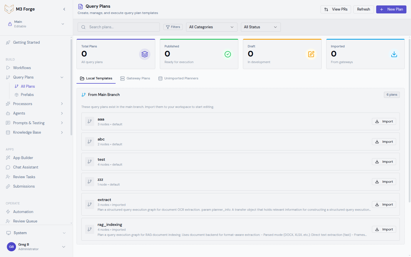 Query Plans are specialized workflows designed for AI agent orchestration. Unlike general DAG workflows, query plans focus on: